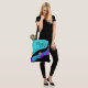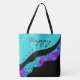 This hand drawn shoulder bag has a bold turquoise top with the word Happy in a fun cursive font (customizable to your name or favorite word). Below, a curved black stripe spells out STUFF in block letters, leading into a vibrant abstract pattern of blue and purple shapes with playful black dots. The bottom is solid black for contrast. It’s roomy, stylish, and perfect for carrying everyday essentials with a cheerful vibe.