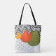 Esta bolsa de tote tem um design moderno do século médio de curvas e linhas ziguezagueadas em preto, círculos em amarelo, laranja e verde, e um retângulo feito de linhas tracejadas.