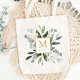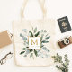 Introducing our Monogram Watercolor Tropical Green Leaves Tote Bag. Featuring watercolor illustration of greenery bouquet arrangement with customizable monogram on the middle in gold color. Suitable as a gift for nature lovers.