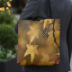 Saco de compras com monograma de Natal botânico Luz Dourada da Natureza. Um presente de Natal atencioso inspirado na natureza para alguém que ama o outono, a beleza tranquila e tons dourados quentes. O design é baseado em uma fotografia botânica suavemente brilhante de folhas de outono douradas em luz natural quente. Os tons dourados suaves criam um clima calmo e elegante que parece orgânico e refinado. Personalize com seu monograma ou nome para um toque significativo e atemporal. Perfeito para amantes da natureza, guarda-roupas de outono aconchegantes, presentes especiais e uso diário com estilo.
