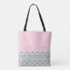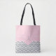 Cinzas monogramas e padrão de fêmur branco com uma barra de tote totalmente Impressão, cor-de-rosa e branca, pastel. O design apresenta uma cinza e um padrão de fêmur branco na metade inferior e na metade superior um padrão de bolinhas rosa e branco pastel. O design é atravessado por uma banda rosa pastel e no meio há um rosa pastel com sua inicial personalizada.