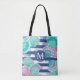 Este saco de tote único e bonito apresenta um lindo padrão verde-lacrimogêneo, dourado, rosa e branco, colocado sobre e sob um fundo de faixa azul marinho. No centro está o seu monograma em branco e colocado numa faixa azul semitransparente do círculo marinho. A parte de trás do saco tem o mesmo padrão de concha, mas sem o banner ou monograma.