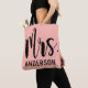 A bolsa personalizada de tote de casamento apresenta um monograma ousado e moderno da sra. script do sobrenome casado da noiva em texto preto na moda com fundo cor-de-rosa. Design de dois lados.