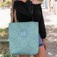 Um saco com um padrão de mandala azul floral na moda com um monograma, um na moda, uma tendência, inicial, com design moderno, elegante, clássico, verde e lacrimogênio, personalizado