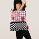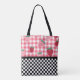 Primavera Whimsical / bolsa de ombro temático de verão apresenta metade superior de morangos vermelhos e cor-de-rosa em gingham rosa e metade inferior do quadro de xadrez preto e branco.