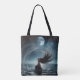 Uma mulher emerge do oceano, seu cabelo molhado criando um arco dramático contra o céu noturno com uma lua de cheio