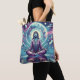 Saco de tote místico. Uma bela e serena ilustração aérea relaxante de uma cena azul e roxa com uma mulher medicando em frente à lua, planetas, estrelas e galáxia para lhe dar uma vibração pacífica. Bonito para uma sala de meditação ou um estúdio de yoga.
