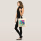 As mulheres Tote Bag têm cores vibrantes azuis, cor-de-rosa, aqua, roxo e amarelo.