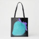 Possui um morango azul/turquesa brilhante com um topo roxo/ rosa com um pano de fundo preto. O brilho do morango até tem um leve reflexo de luz na superfície preta contra a qual está posicionado. Muito brilhante e divertido.