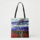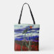 Num céu noturno com algumas nuvens está uma lua de cheio que é vermelha e ascensão sobre um conjunto de montanhas e colinas. Um corvo é empoleirado em um galho de uma árvore-passarinho-morto olhando para a floresta de árvores de folhas vermelhas. Trabalho de arte Copyright ©2018 Kimberly J Tilley.