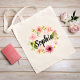 O design de saco de tota personalizado apresenta um monograma de um nome em um roteiro preto moderno, escrevendo por um lindo design floral pintado com cor d'água, cor-de-rosa pastel, pincel, primavera de pêssego, dahlia e flores de rosa emparelhadas com uma folhagem verde vibrante. Faz um presente de excelente para a sua festa de casamento / damas de honra!