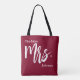 Esta bolsa de tote burguesa diz "A Nova Sra" e tem texto adicional para o sobrenome. A Sra. está em um roteiro branco elegante. Todo texto é branco e pode ser editado ou excluído.