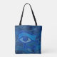 Saco de tote com o desenho abstrato azul texturizado do Olho de Hórus. Este desenho apresenta o Olho de Hórus em tons azuis sobre Olhos de Hórus desbotados no fundo.