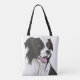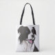 Esta design incomum de sacola de tote útil mostra o desenho de um Collie de Borda preto e branco com olhos azuis. O desenho é baseado no meu próprio cigano de estimação, que foi um amigo leal por muitos anos. Ela olhos azuis, mas eu também vi Collies com olhos castanhos, e até um de cada!