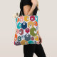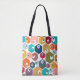 Esta bolsa tote tem um design moderno de meados do século de hexágonos em muitas cores com círculos pretos e brancos dentro deles.