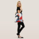 Um design moderno e abstrato que consiste em blocos coloridos curvos de vermelho, branco, azul e preto faz com que esta bolsa de tote se destaque.