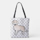 Esta bolsa apresenta a ilustração original de desenho animado de Destei de um Ouro bonito de raça Retriever em inglês creme casaco. O fundo tem um padrão de pegadas de cinza.