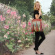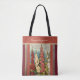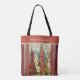 Esta elegante bolsa de tote de vintage apresenta trabalho de arte de pacote de sementes de vintage de hollyhocks de um pacote de sementes de Farquhar de 1902, com cor vermelha, pêssego escuro e flores botânicas de creme. O nome do seu monograma está impresso no topo em uma cor de creme de ouro - digite o texto desejado na seção Personalizar. As laterais do pacote estão bordadas em um padrão de aspecto têxtil escuro, vermelho e dourado. Toda a design é impressa achatada, embora haja alguma textura falsa.