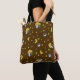 Padrão com xícaras de café, flores e croissants sobre fundo castanho escuro
