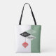 Um saco de tote de na moda retro chic para a época de Natal numa design moderna do século médio que tem formas geométricas de diamante com texto Feliz de Natal. Um ornamento de natais vintages em vermelho vivo de coral pendura do padrão em forma de diamante. O fundo inclui um design de bloco de cor verde e branco. Espalhe a alegria de férias no shopping, no supermercado, no trabalho ou na escola, e em qualquer lugar que você vá durante o feriado.