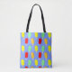 Pop de gelo de fruta em um padrão. Personagens de desenho animados sorridentes. Sacos de tote. Ideia para adultos e crianças.