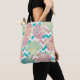 Esta elegante sacola de tote para seus recursos apresenta falso brilho, conchas coloridas em múltiplas cores de chalé, coral rosa, aqua e ouro. As conchas são colocadas em listras de chevron azul-aqua que também contêm imagens do padrão-concha, e as contrastadas com listras de chevron brancas. Ambos os lados da bolsa têm a mesma imagem.