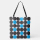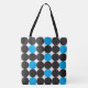 Este saco de totas moderno apresenta um padrão geométrico de pontos grandes e negros em preto e azul claro em ambos os lados.