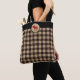 O fundo deste saco de tote estilo lumberjack é uma variação vermelha, bronzeada e preta no popular padrão de xadrez de búfalo. No centro superior há uma faixa de círculo bronzeada com uma imagem de alce vermelha correspondente, colocada em uma borda superior preta. A parte de trás da bolsa tem o mesmo padrão e imagens.