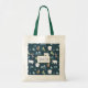 Um saco de tote com um padrão festivo caprichoso. Ursos polares, renas, árvores, raposas e flocos de neve. Num fundo verde escuro.
