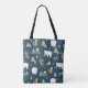 Saco com um padrão festivo caprichoso. Ursos polares, renas, árvores, raposas e flocos de neve. Num fundo verde escuro. Um quadro retangular com uma borda falsa de folha de ouro com o seu nome dentro.