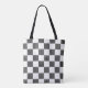 This tote bag has a fun pattern of painted black squares and plain white squares arranged in a checkerboard print. There's a spot at the top of the bag for adding a name or your own custom message in black script lettering.