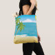 Uma vista cênica de uma praia de palmeiras com um sol brilhante. Este design parece realmente eficaz nesta Tote Bag