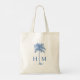 Esta bolsa de tote inspirada na costa moderna apresenta uma palmeira azul com um monograma que você pode personalizar com sua escolha de iniciais em cada lado.