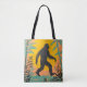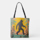 Um bolsa para comprar e outras atividades. Uma silhueta de Pé Grande em uma floresta. Imagem idêntica em ambos os lados do bolsa.
