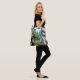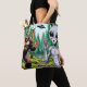 Totebag apresenta trabalho de arte de humor de Sasquatch encontrando uma alienígena de cinza na floresta. Ambos estão surpresos em se ver! A ilustração cômica também apresenta um OVNI em segundo plano.