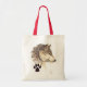 Mostre um belo perfil de lobo em uma bolsa de tote útil. Uma impressão de pata completa a foto.