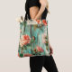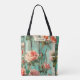 Make a stylish statement every day with this tote. It features a vibrant vintage floral pattern of pink, peach, and coral roses contrasting beautifully with the distressed turquoise wood background. This shabby-chic, rustic design is rich in color and texture. Add your name or message for a custom touch.
