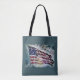 Esta imagem de bandeira americana, é destacada contra, fogos de artifício que explodem, numa exibição colorida de, vermelho, branco, azul e amarelo, flares em um céu nublado e crepúsculo, de azul ardente.