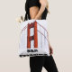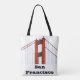 Um saco de tote preto e branco bonito apresenta a icônica torre vermelha vibrante da ponte de Gate do Ouro com as palavras SAN FRANCISCO em preto.
