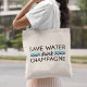 Faça a sua parte para aliviar a seca com o nosso super fofo champanhe temido bolsa. O design de tipografia apresenta a citação "Save Water, Drink Champagne" em letras negras com detalhes de onda oceânica azul.