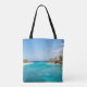 Um saco de tote com uma bela foto com um resort de praia tropical. Bonito água azul e praia branca arenosa com aqueles cabanas que lhe dão uma vibração tranquila na ilha. Um círculo branco colocado sobre o topo com seu nome e dentro inicial monograma.