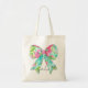 Esta bolsa de tote fofa apresenta um grande arco em tons de rosa e verde pré-disquetes e o nome em preto. Personalize com sua escolha de nome na frente e texto especial no verso. Excelente para o fim de semana de uma garota ou como um saco de presentes personalizado!