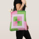 Esta imagem é um desenho abstrato geométrico com camadas quadradas concêntricas que espiralam para dentro. Os quadrados são feitos de cores ousadas e contrastantes: amarelo, laranja, vermelho, verde-oliva e roxo profundo. Cada quadrante alterna de cor, dando ao design um efeito dinâmico e quase óptico semelhante a ilusão. A combinação de tons quentes e legal cria um sentido de profundidade e equilíbrio.