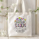 O professor Sayings Modern Flower Personalized Name Tote Bags apresenta flores silvestres coloridas com o texto "Professores plantam sementes que crescem para sempre" em uma divertida tipografia moderna de roteiro e personalizada com seu nome personalizado. Perfeito para a apreciação dos professores pelo Natal, aniversários e feriados. Concebido por © Evco Holidays www.zazzle.com/store/evcoholidays