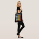 Este design de sacola de tote fofo apresenta lápis coloridas e arco-íris sobre um fundo preto.