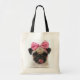Pug dog com a língua para fora com uma fita rosa sequenciada, fundo branco.
