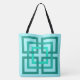 Saco de tota impresso num padrão retrormoderno de praças interligadas, em tons de luz a tartaruga/pavão profundo, num fundo de aqua pastel