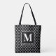 serif clássico monograma, preto e branco, com formato quatrefoil, em todo o saco de impressão tote