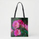 Rosas brilhantes no jardim floral esmagam através de um saco de tote útil.