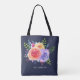 Um saco de tote personalizado com um bom buquê de rosas de aquarelas com galhos, folhas e galhos todos juntos em um arranjo floral colorido. fundo azul marinho.